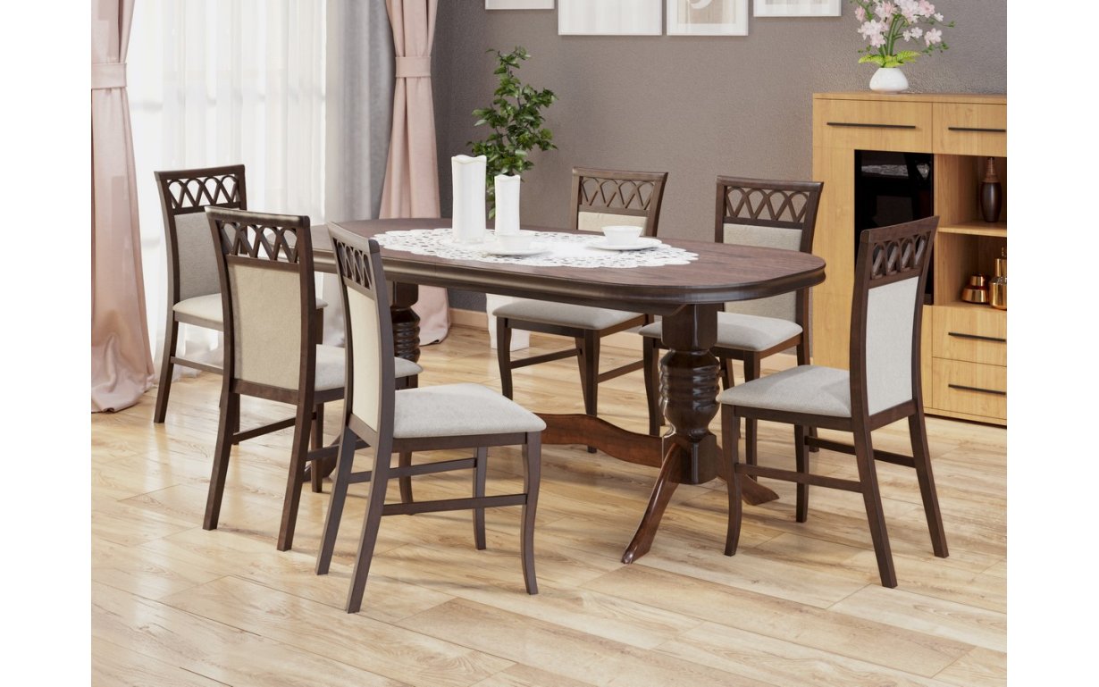 • Розкладний обідній стіл Гранд – прямокутний стіл на фігурних ніжках для обідньої кімнати, виконаний у стилі сучасної класики з екологічно чистих матеріалів з використанням натурального дерева (вільхи).