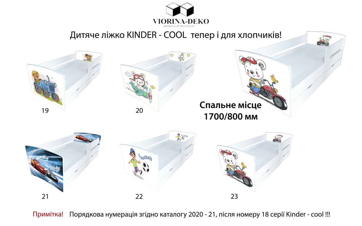 Кровать Киндер кулл - идеально подойдет для детской комнаты ваших домочадцев. Своих обладателей будет радовать простотой и функциональностью. Фабрика Viorina Deko потрудилась над созданием всевозможных видов оформления рисунками (персонажи всем известных мультфильмов, животные, футбол, флора и фауна и т.д ) , благодаря чему выбор расцветки для кровати превратится в маленькую, забавную игру.