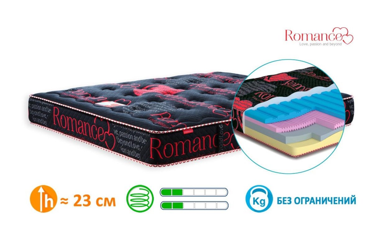 Матрац Romance від Matroluxe — безпружинна модель з яскравим дизайном і необхідним для здорового сну наповненням. Одна з її сторін володыэ ефектом пам'яті за рахунок матеріалу Natural Memory. Виріб не має обмежень щодо максимально допустимого навантаження. Його поверхня досить м'яка на дотик завдяки застосуванню тканини Soft Plus. Загальна висота становить 23 см, а гарантія — 5 років.